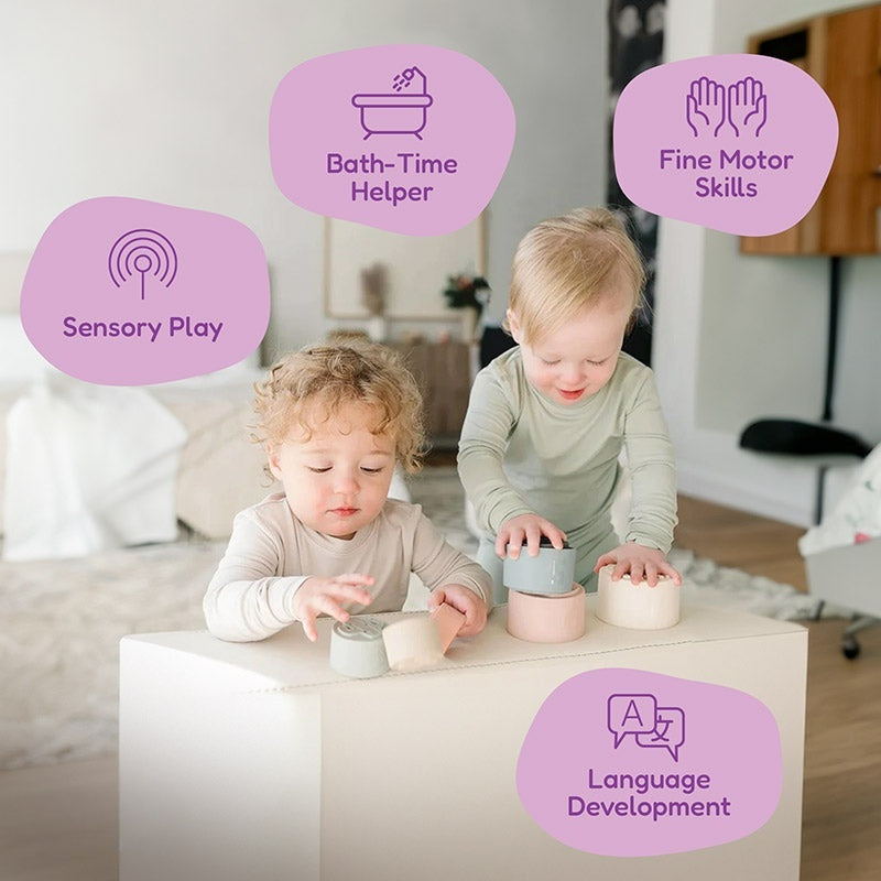 From their very first grab to stacking towers at the beach, these cups grow with your baby — strengthening fine and gross motor skills, balance, and hand–eye coordination along the way.