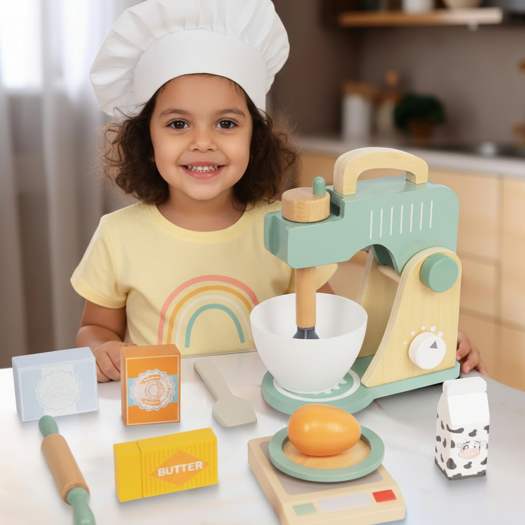 Children love to mirror what they see. This mixer set allows them to feel part of everyday kitchen routines — mixing, counting ingredients and “serving” meals alongside you.