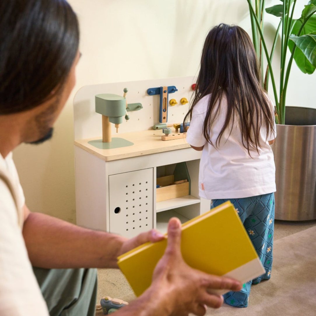 - Includes: Wooden workbench + assorted play tools & hardware pieces