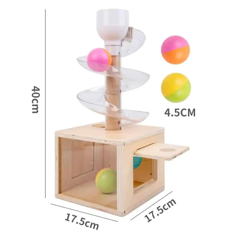 The 3-Exit Object Permanence Slider Box invites your little one to explore movement, repetition, and joyful discovery. As the ball rolls down the soft wooden ramp and disappears, babies begin to understand how objects move — and that they still exist even when out of sight.